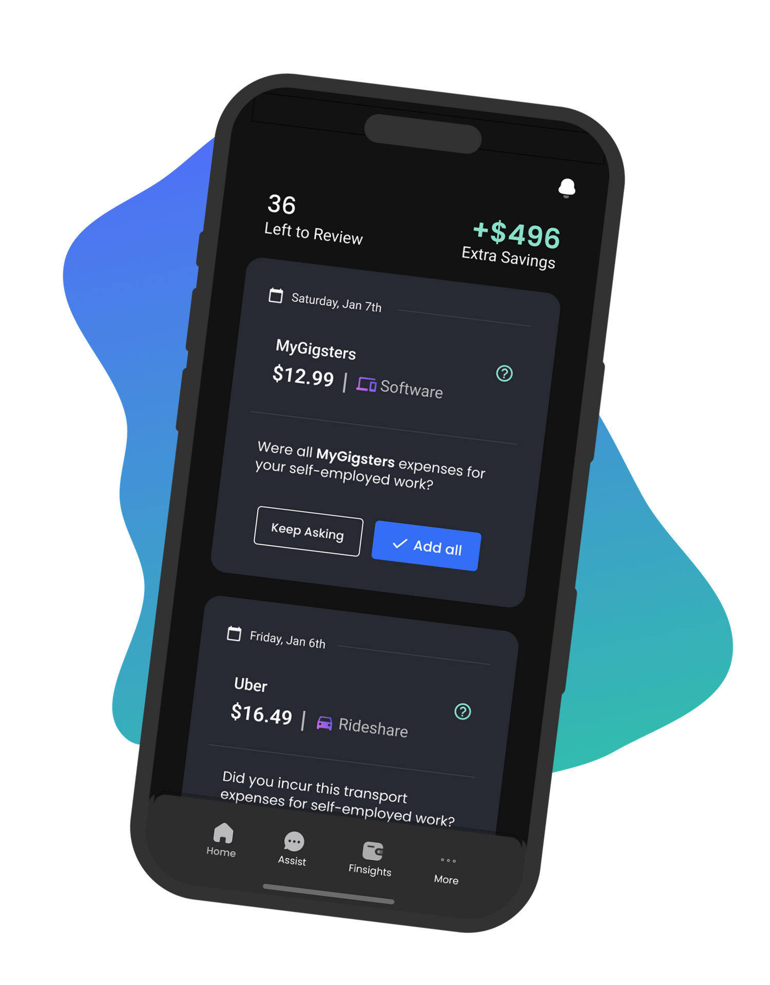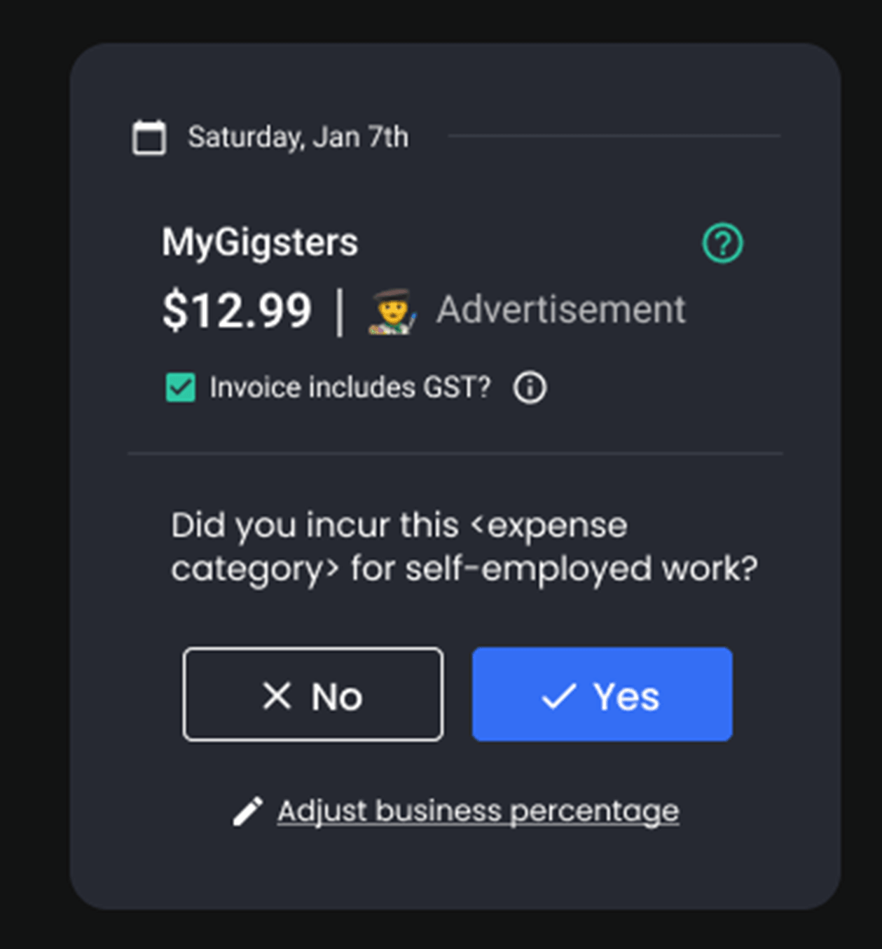 When we onboard you to the app, we will ask you relevant questions about your gig that will help us create your tax profile. The tax profile will inform the AI on which expenses are eligible for tax deductions.
