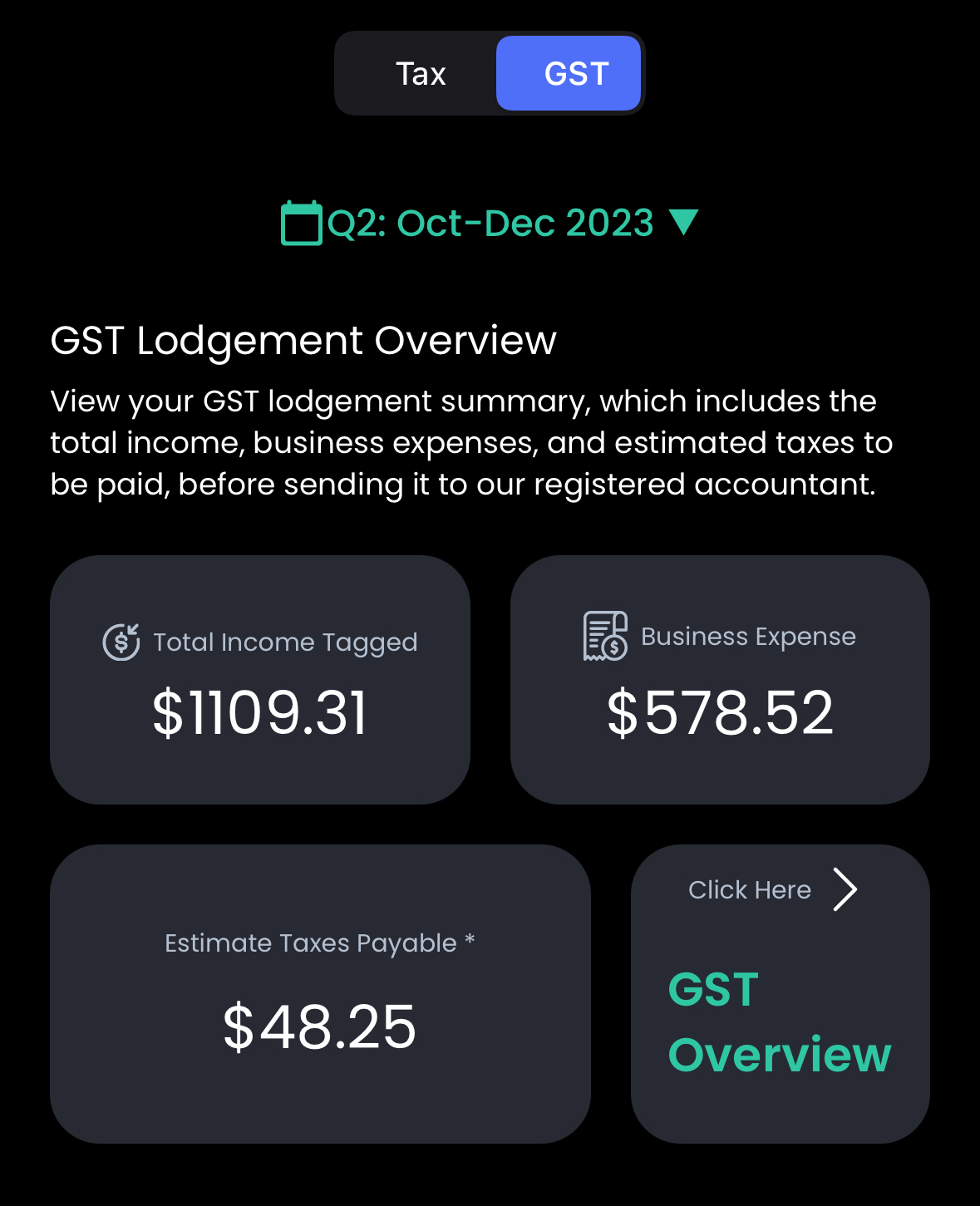 With a tap of a button, you can get a quick view on your estimated tax and GST position. This will help you plan things and work with us proactively to maximise your returns.